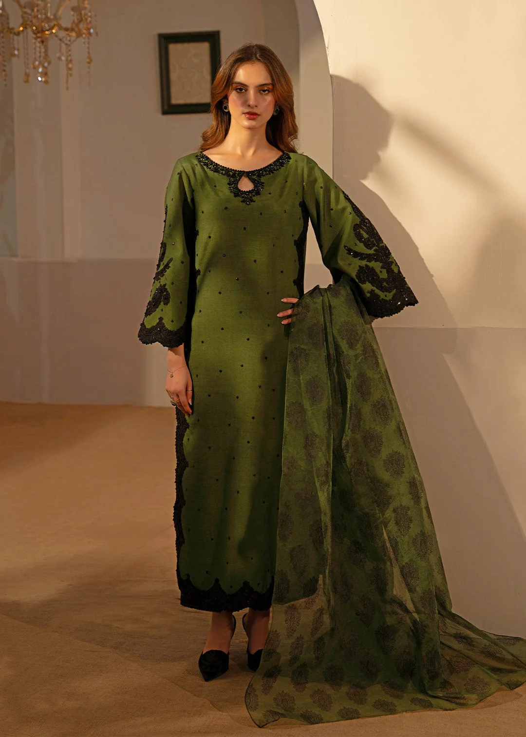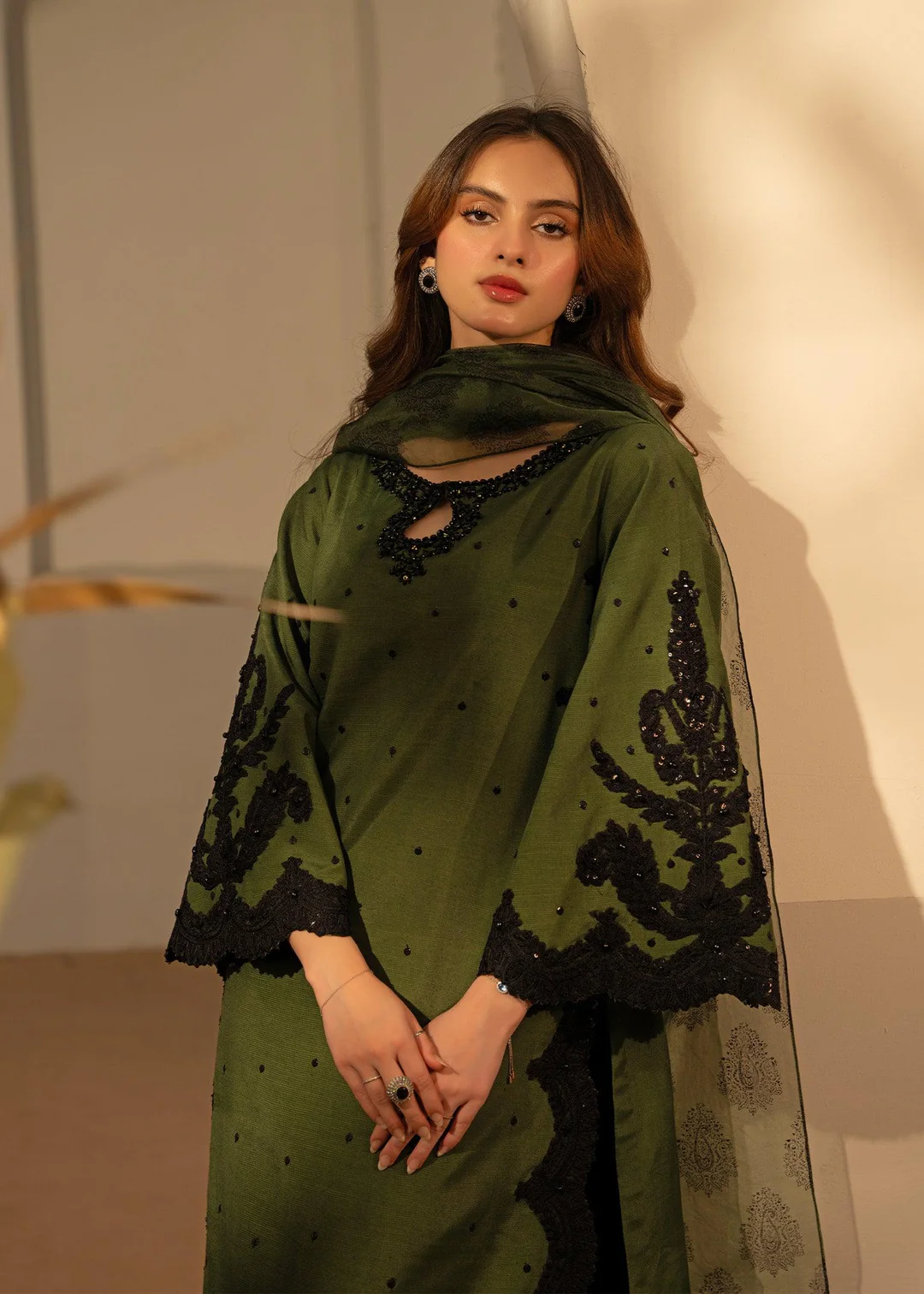 A long cotton lawn shirt featuring delicate handmade thread embroidery along all edges, paired with a plain trouser and a digitally printed Minar dupatta.