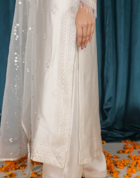 The trousers are detailed with an embroidered patti offering a refined and coordinated look that completes the ensemble.