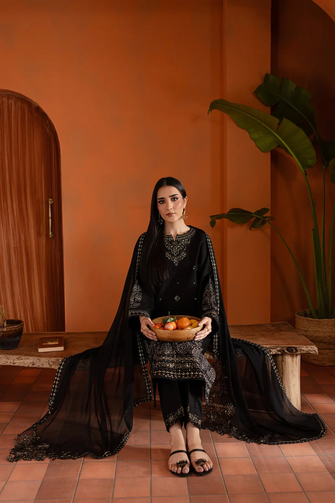 The 45-46 inches shirt in black Premium Cotton exudes luxury with heavy embroidered borders, an intricately embroidered neckline and an organza patch on the sleeves which further enhances the over all embroidery.