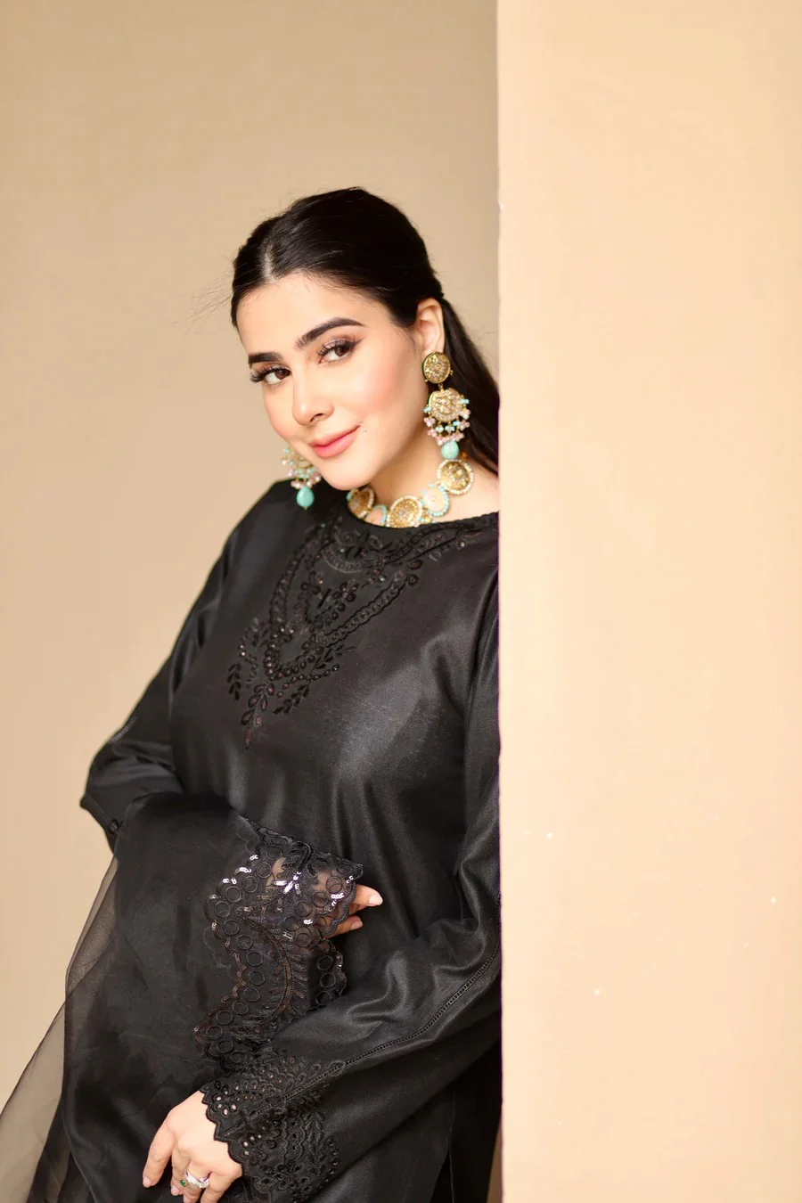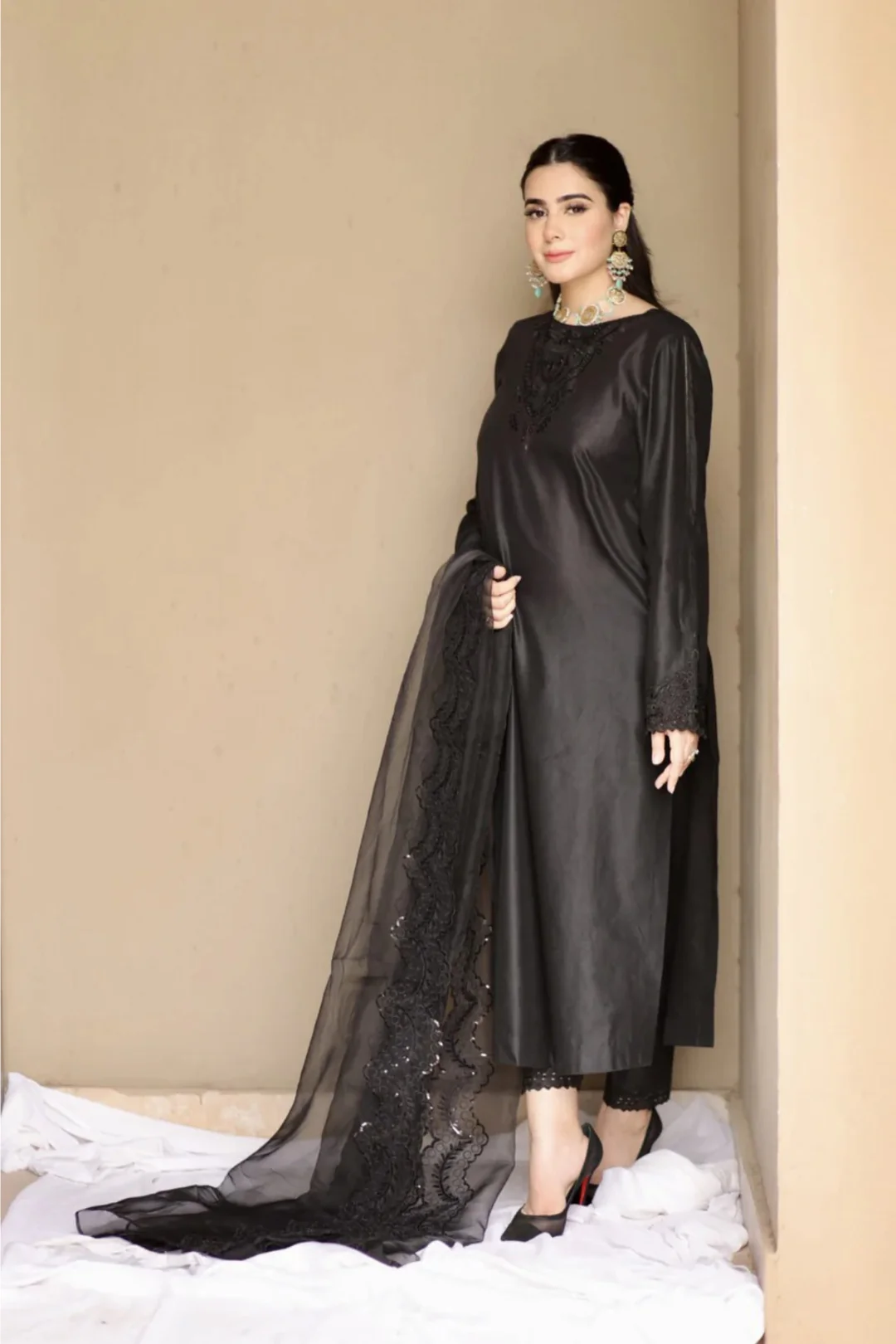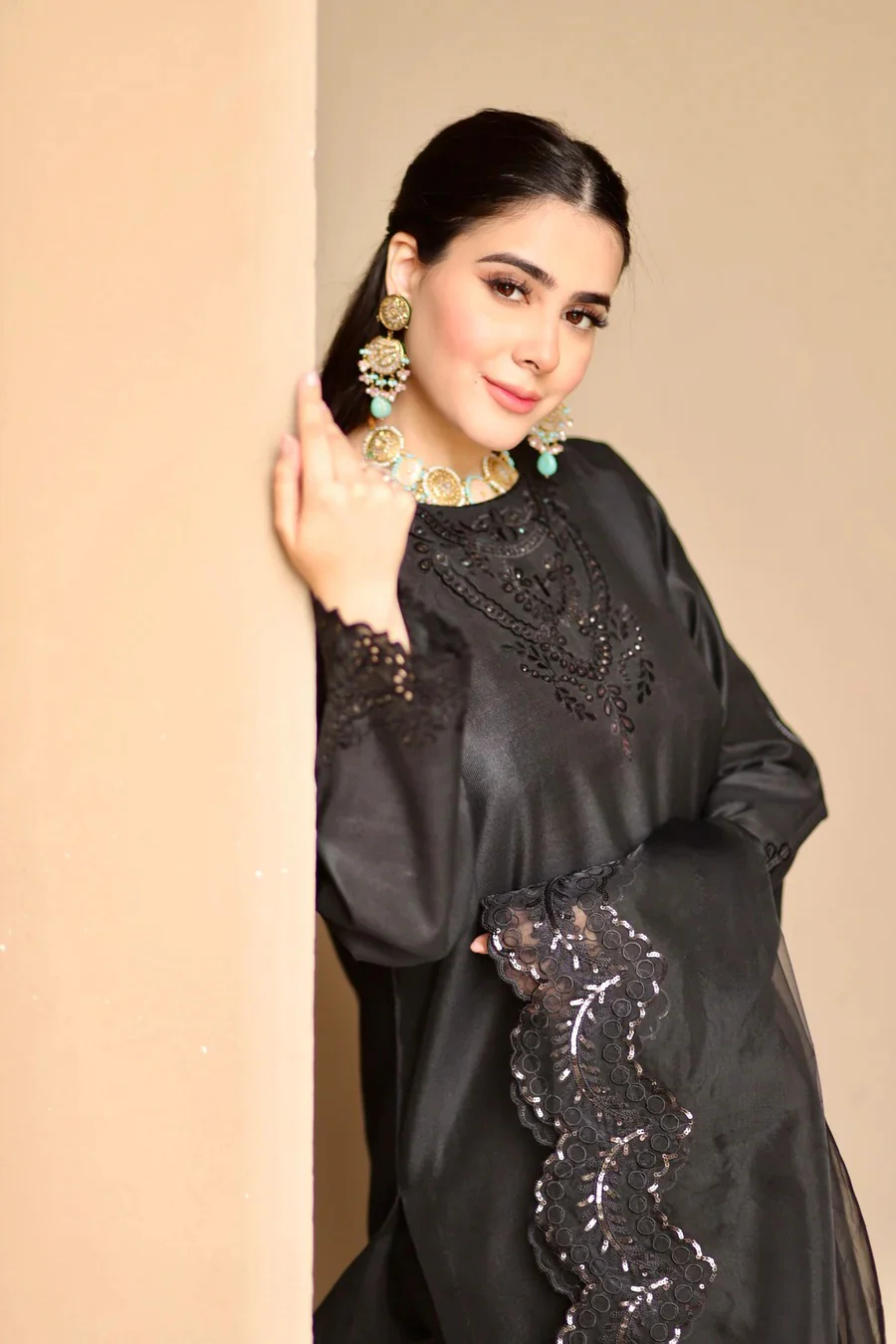 Long shirt paired fitted trouser with detailed cutwork embroidery paired with the black sequence embroidered dupatta