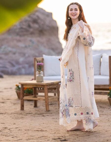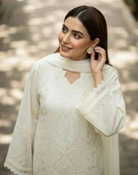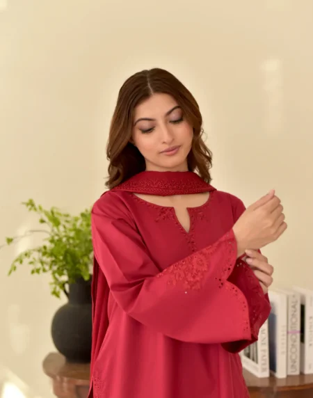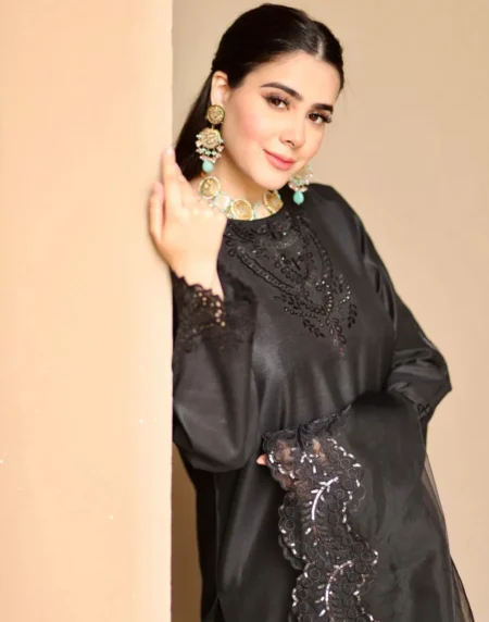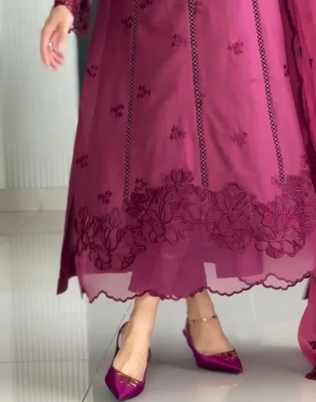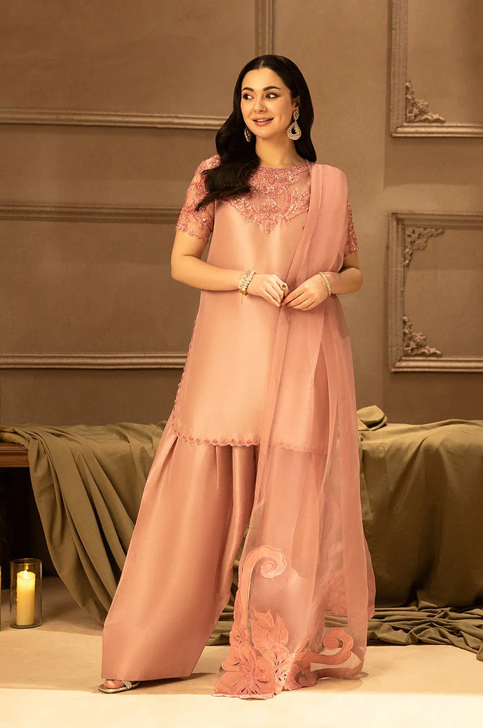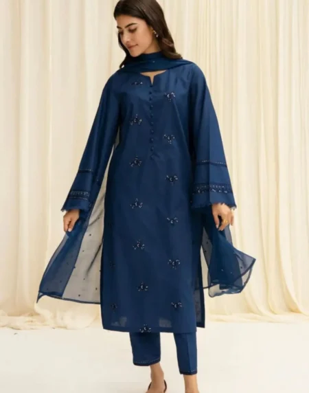 Soft as twilight and refined in every detail, Dusk captures the elegance of muted woven into luxurious Cotton. The neckline and sleeves shimmer with delicate 3D crystal embellishments, adding depth and sparkle without overpowering the look. Paired with a gracefully tailored farshi shalwar and a breezy organza dupatta, the ensemble strikes a perfect harmony between glamour and grace.