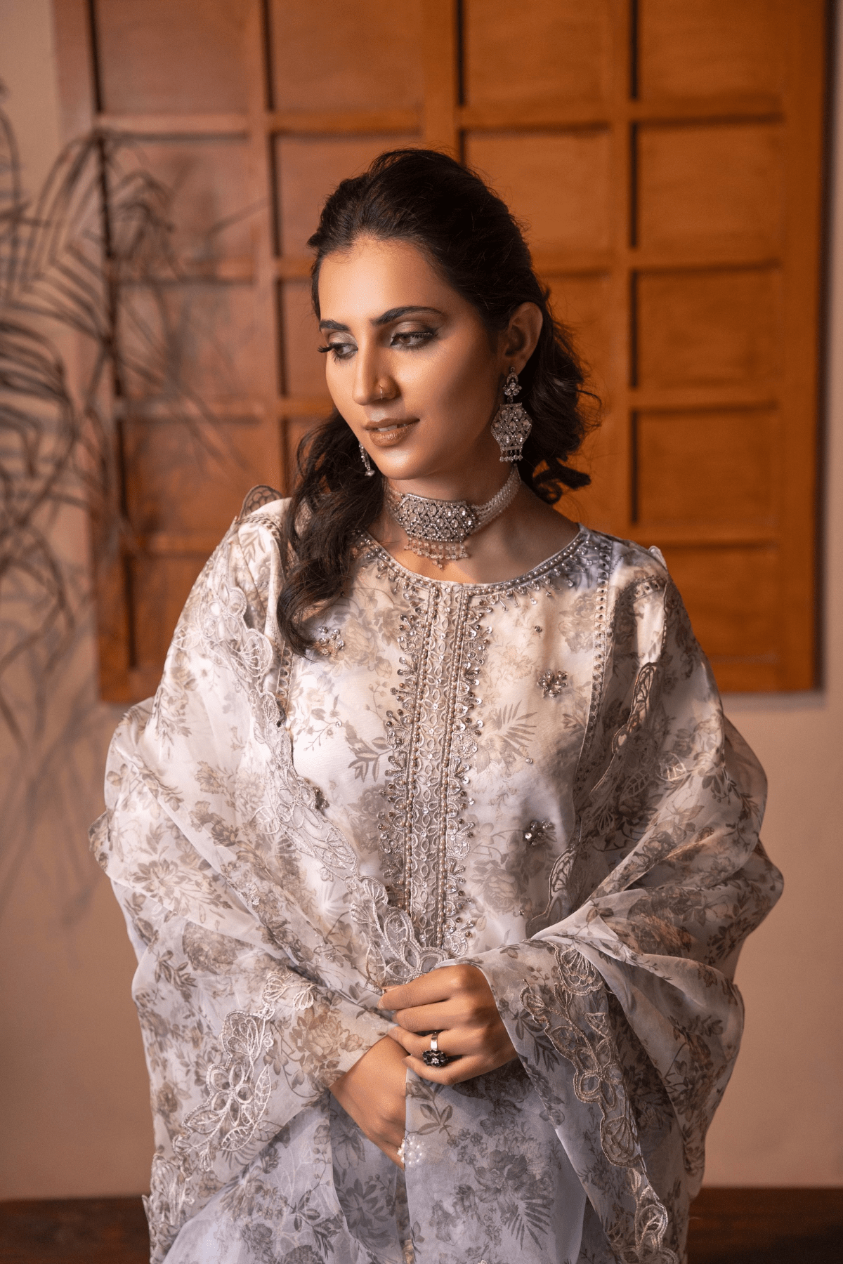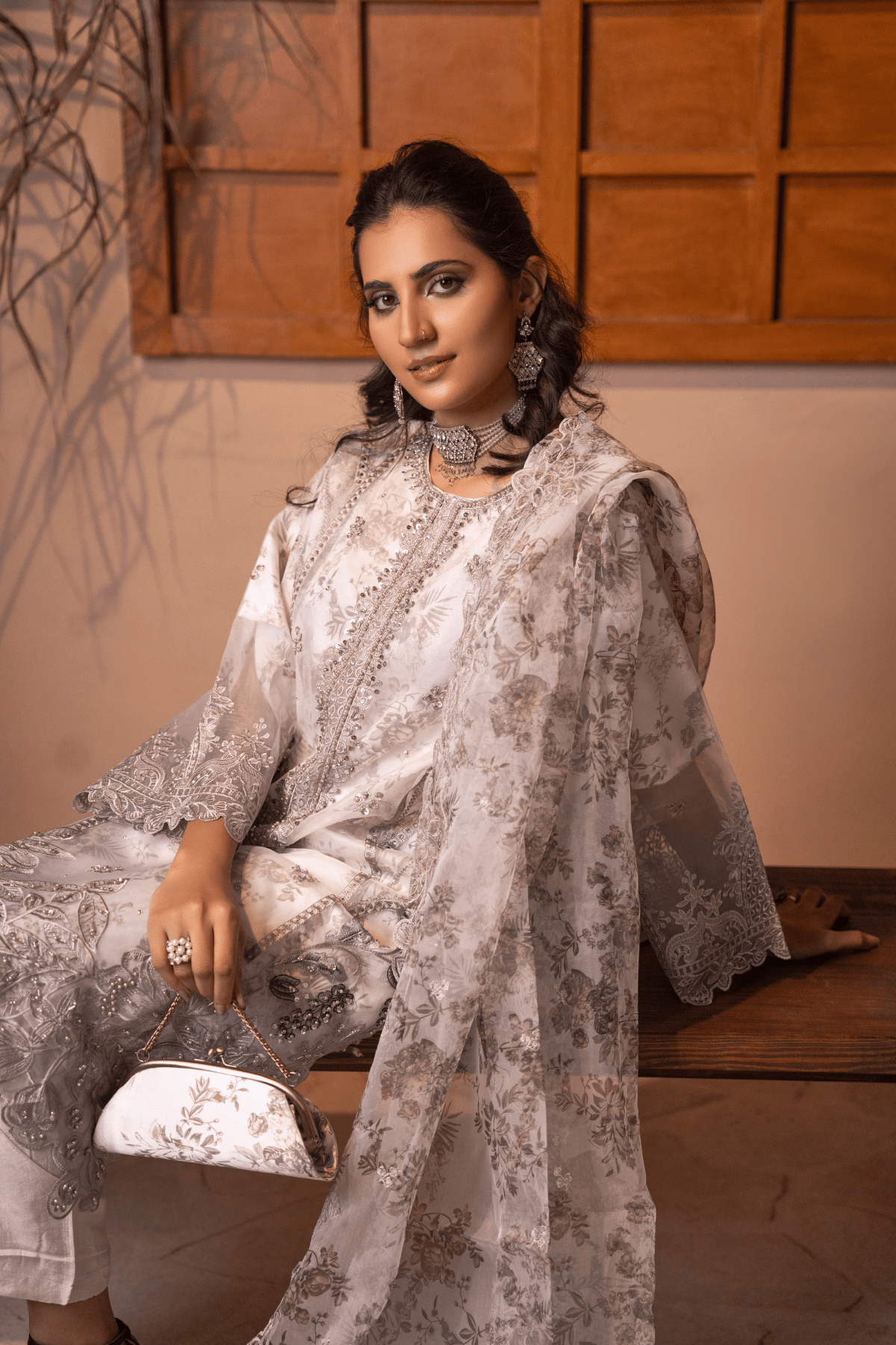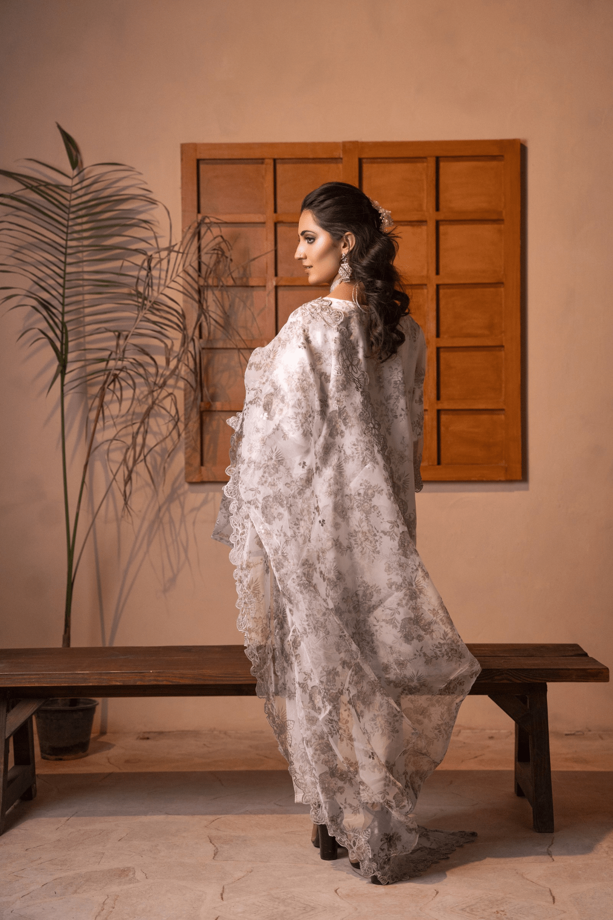 The rich Organza is enhanced with handwork and embroidery, giving it a graceful and timeless appeal. Paired with a well-balanced silhouette, it reflects understated luxury and modern tradition.