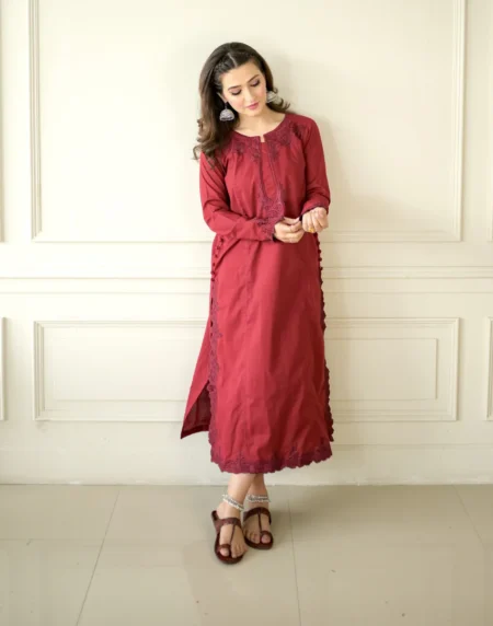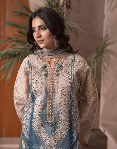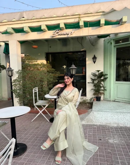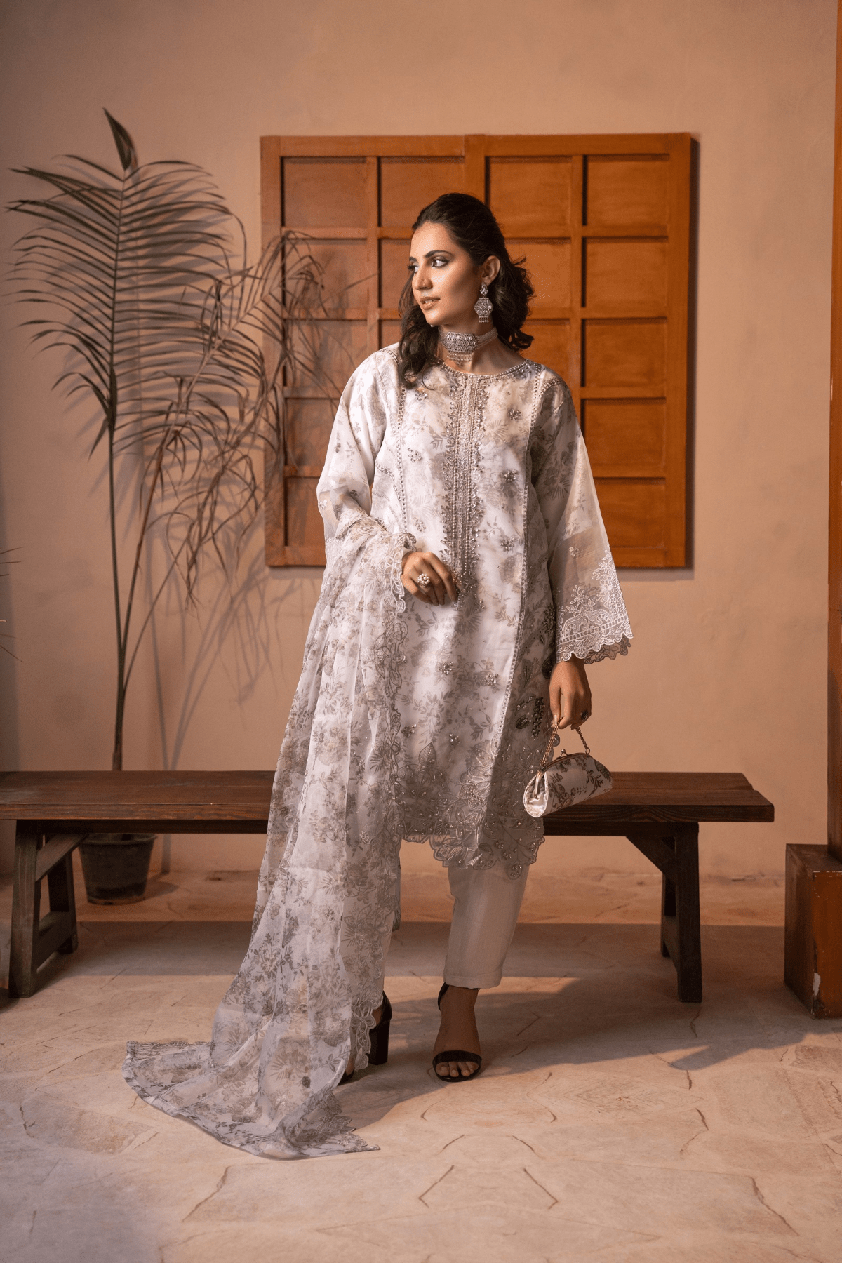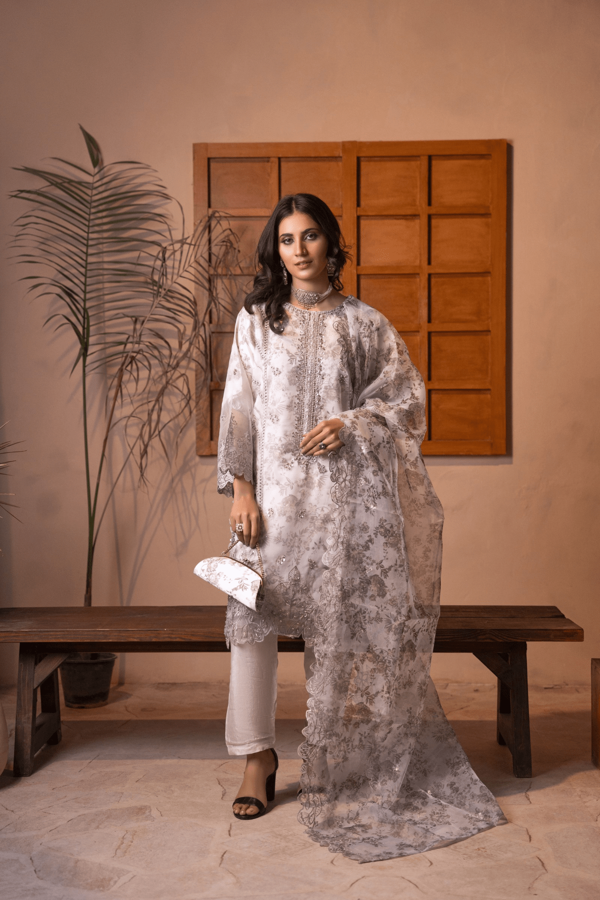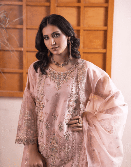 The rich Organza is enhanced with handwork and embroidery, giving it a graceful and timeless appeal. Paired with a well-balanced silhouette, it reflects understated luxury and modern tradition.