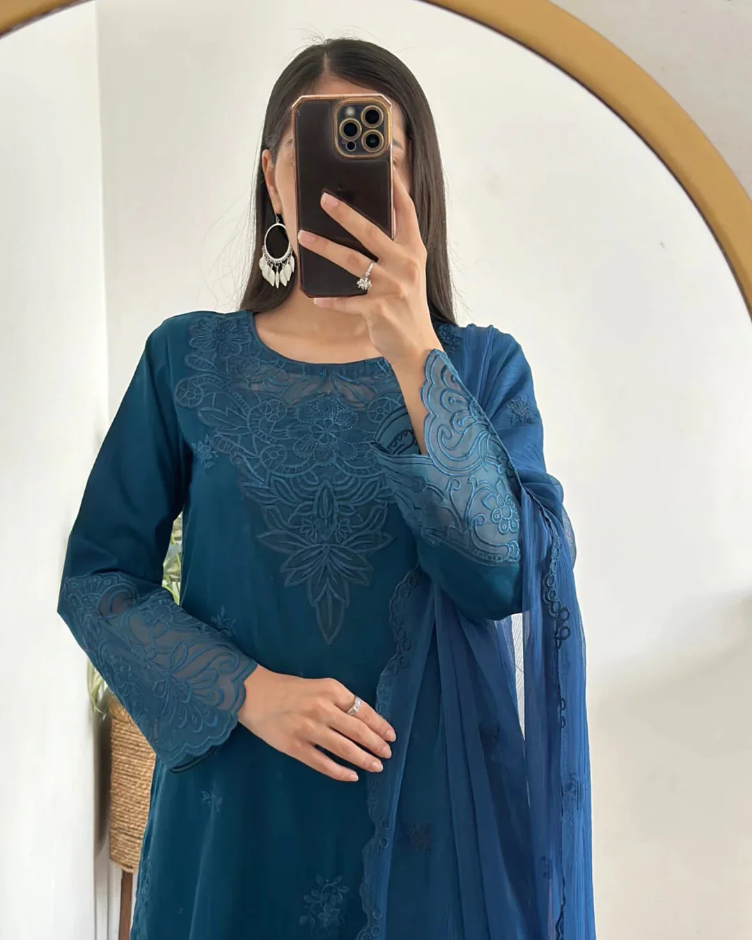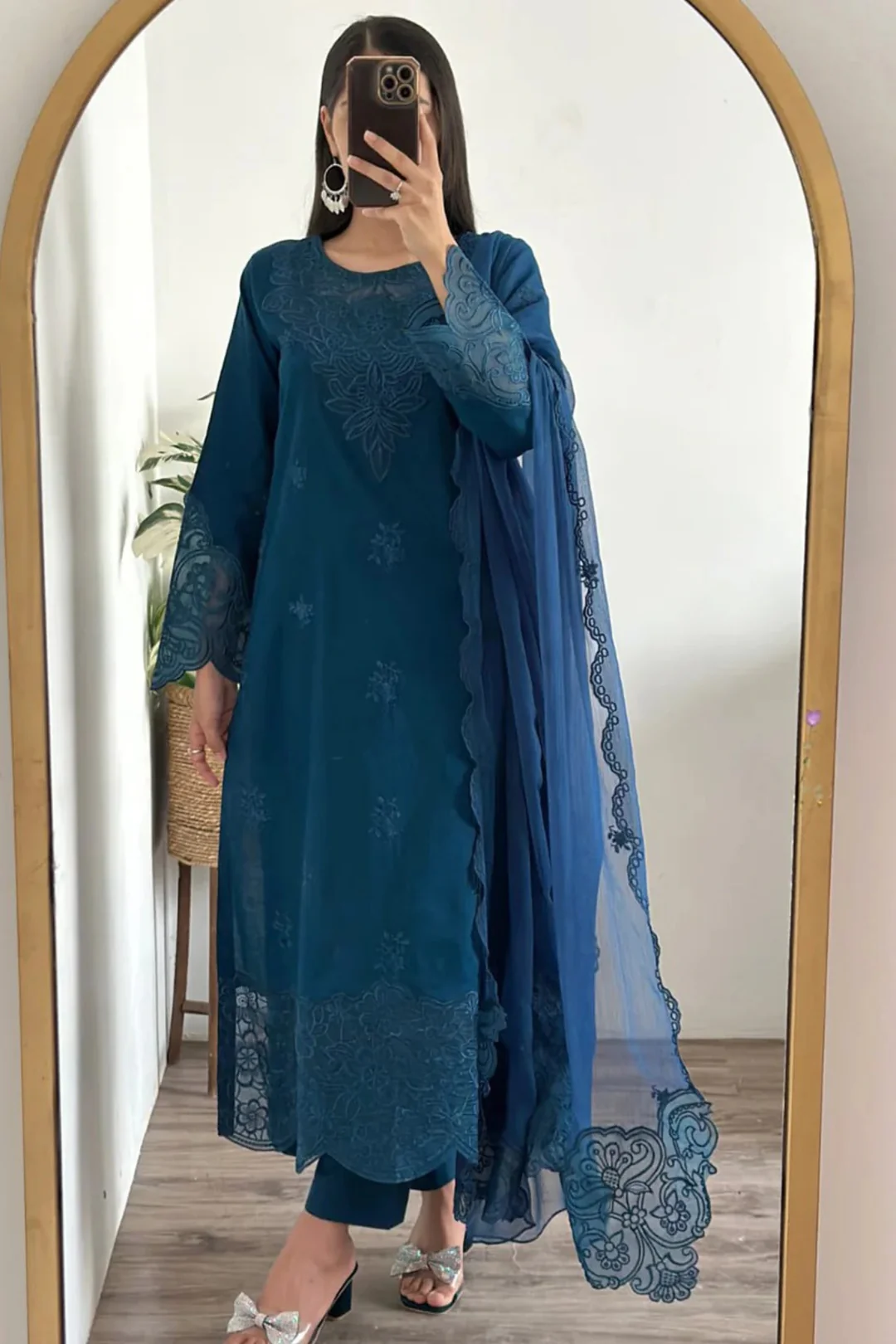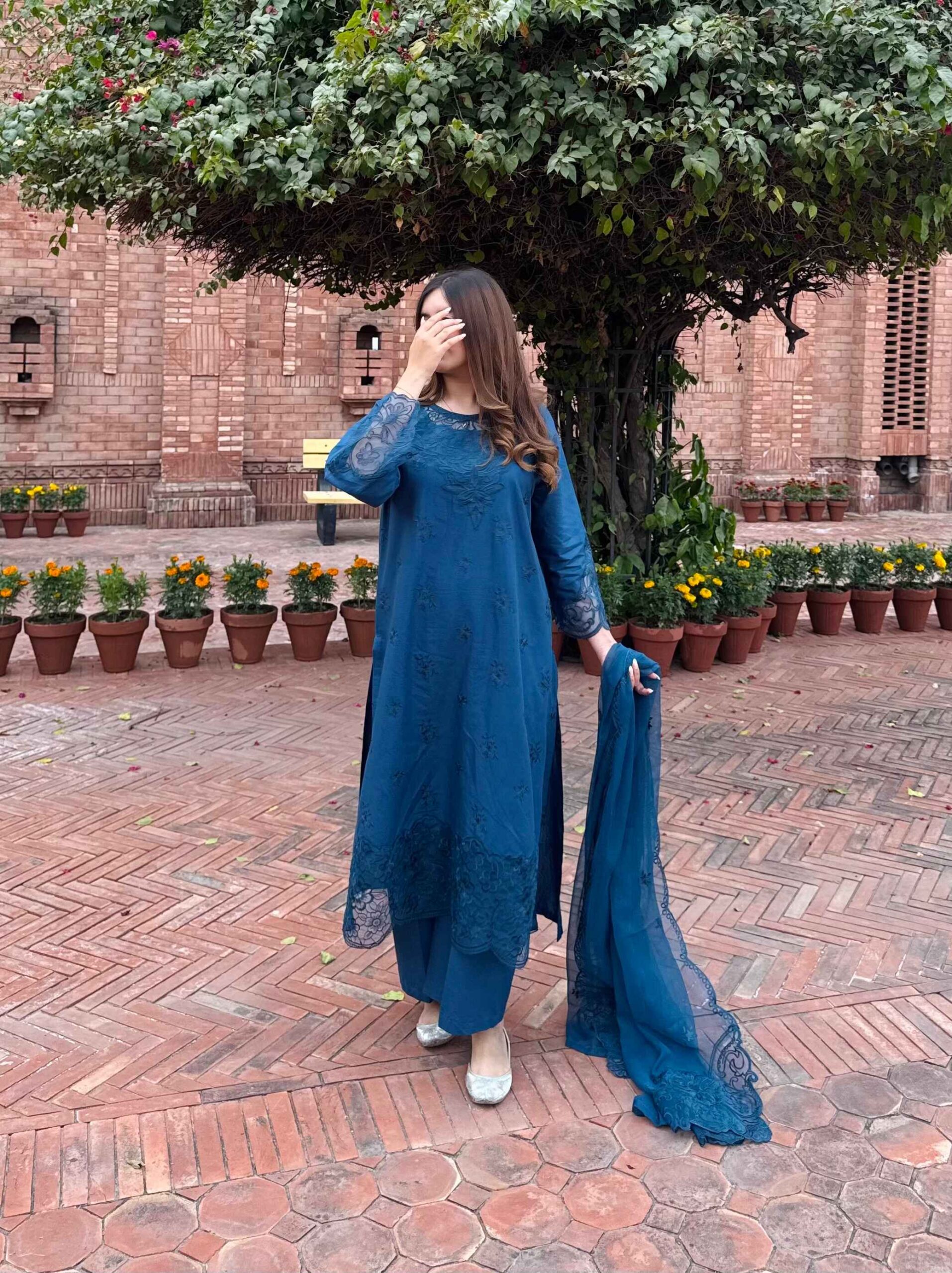A 3-piece zinc blue suit with a cotton shirt and trouser, paired with an embroidered chiffon dupatta. The shirt features tone-on-tone embroidery with patches on the neckline, sleeves, and borders, creating a chic monochromatic look perfect for elegant day or evening wear.