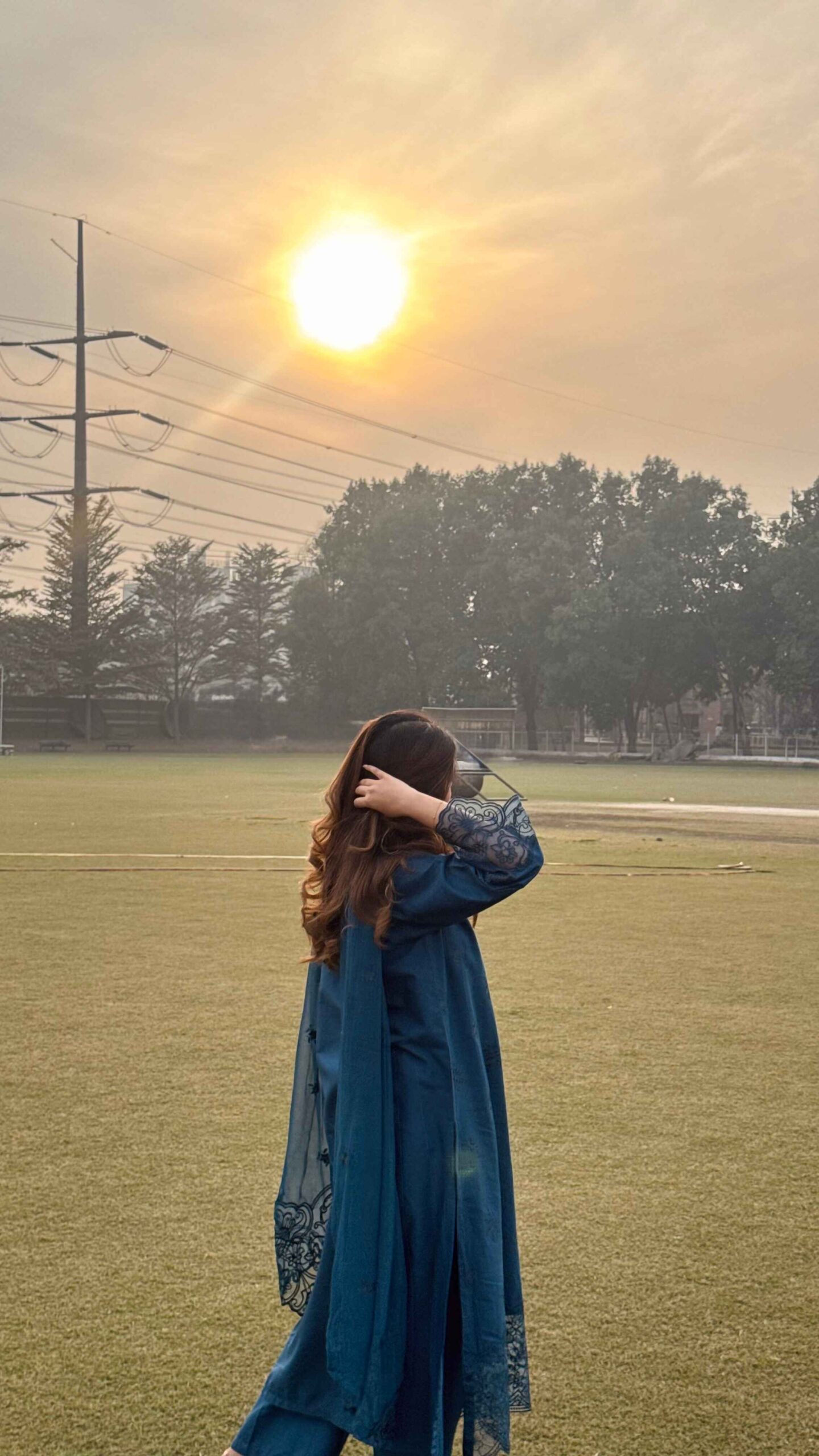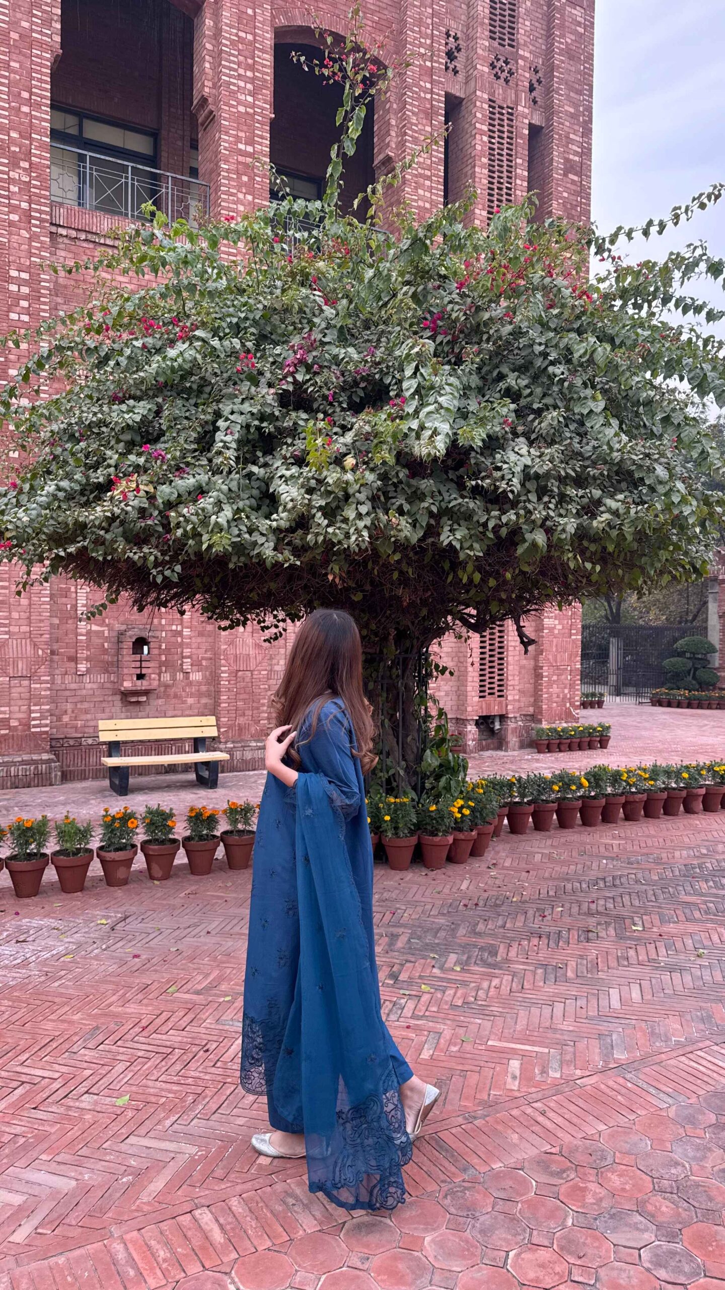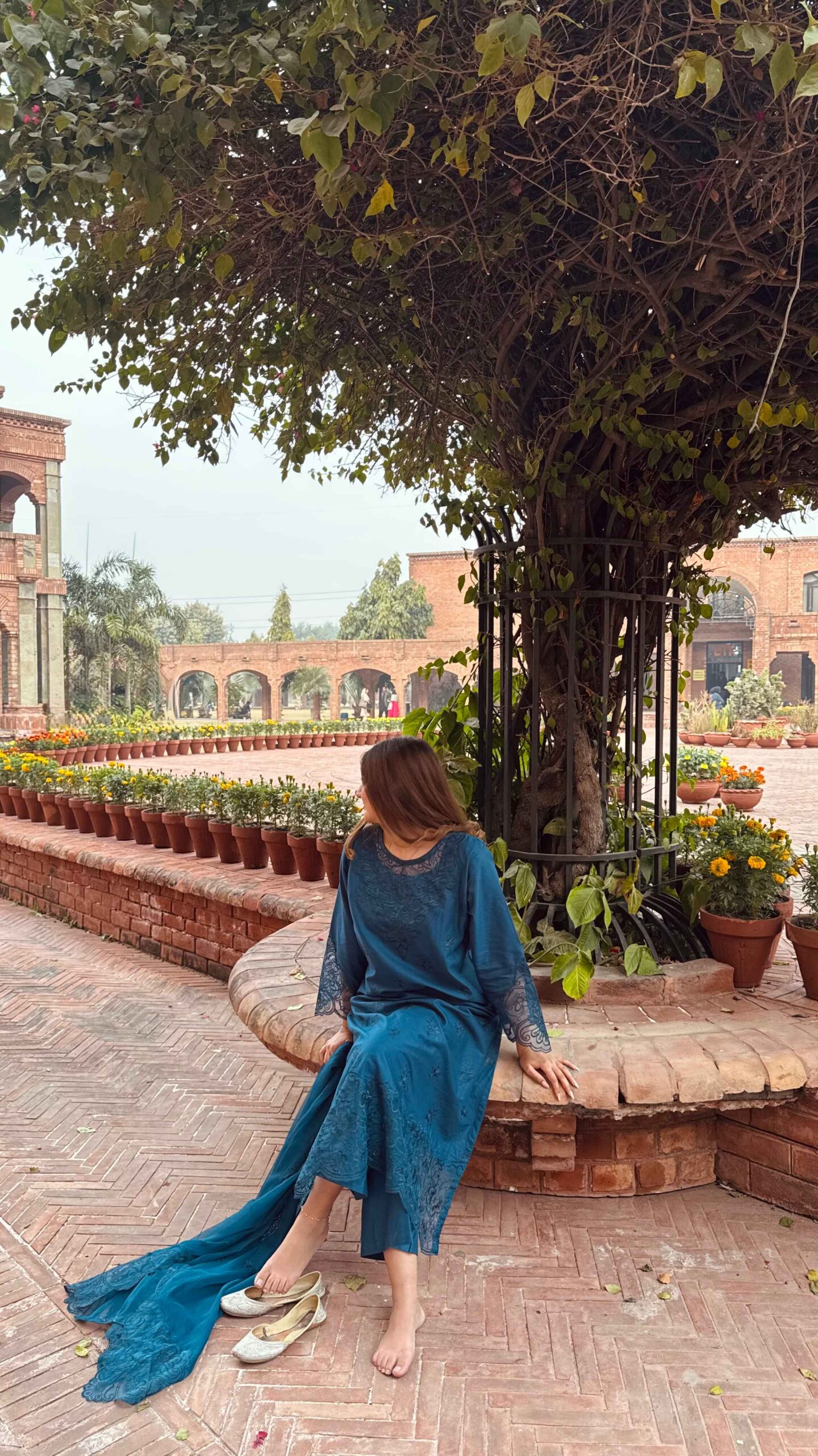 Mystic Glaze is a 3-piece ready-to-wear suit in a sophisticated zinc blue shade. The shirt and trouser are crafted from premium cotton, while the dupatta is made of lightweight chiffon. The plain trouser balances the look, while the embroidered chiffon dupatta adds elegance. The shirt features detailed embroidery with decorative patches on the neckline and sleeves, along with an embroidered border. All embroidery is done in the same tone as the fabric, creating a refined monochromatic look that is both graceful and modern perfect for elegant day and evening wear.
