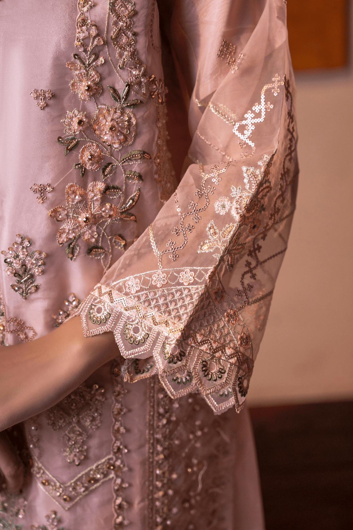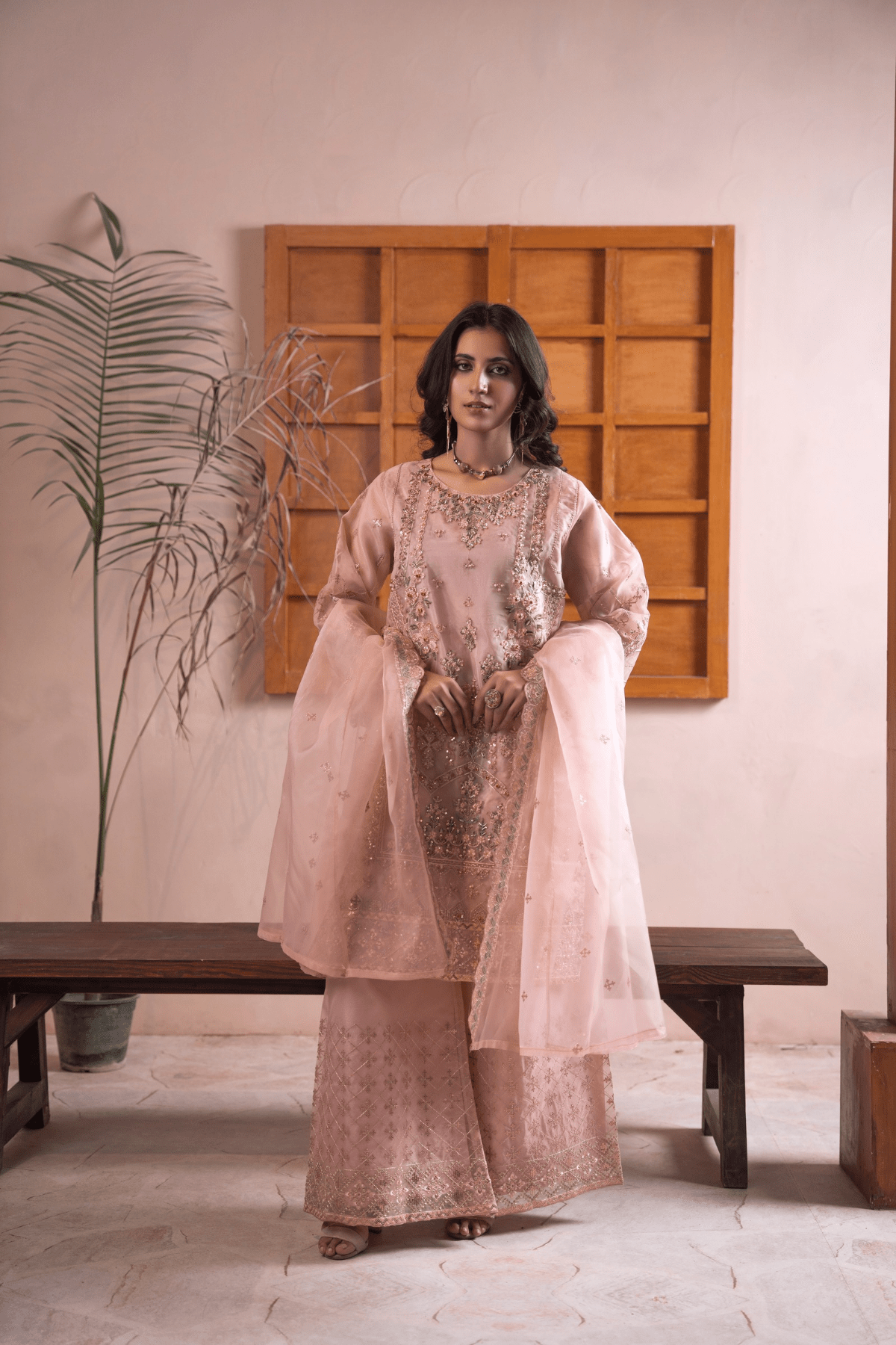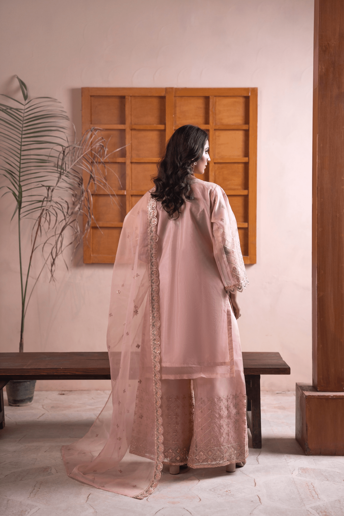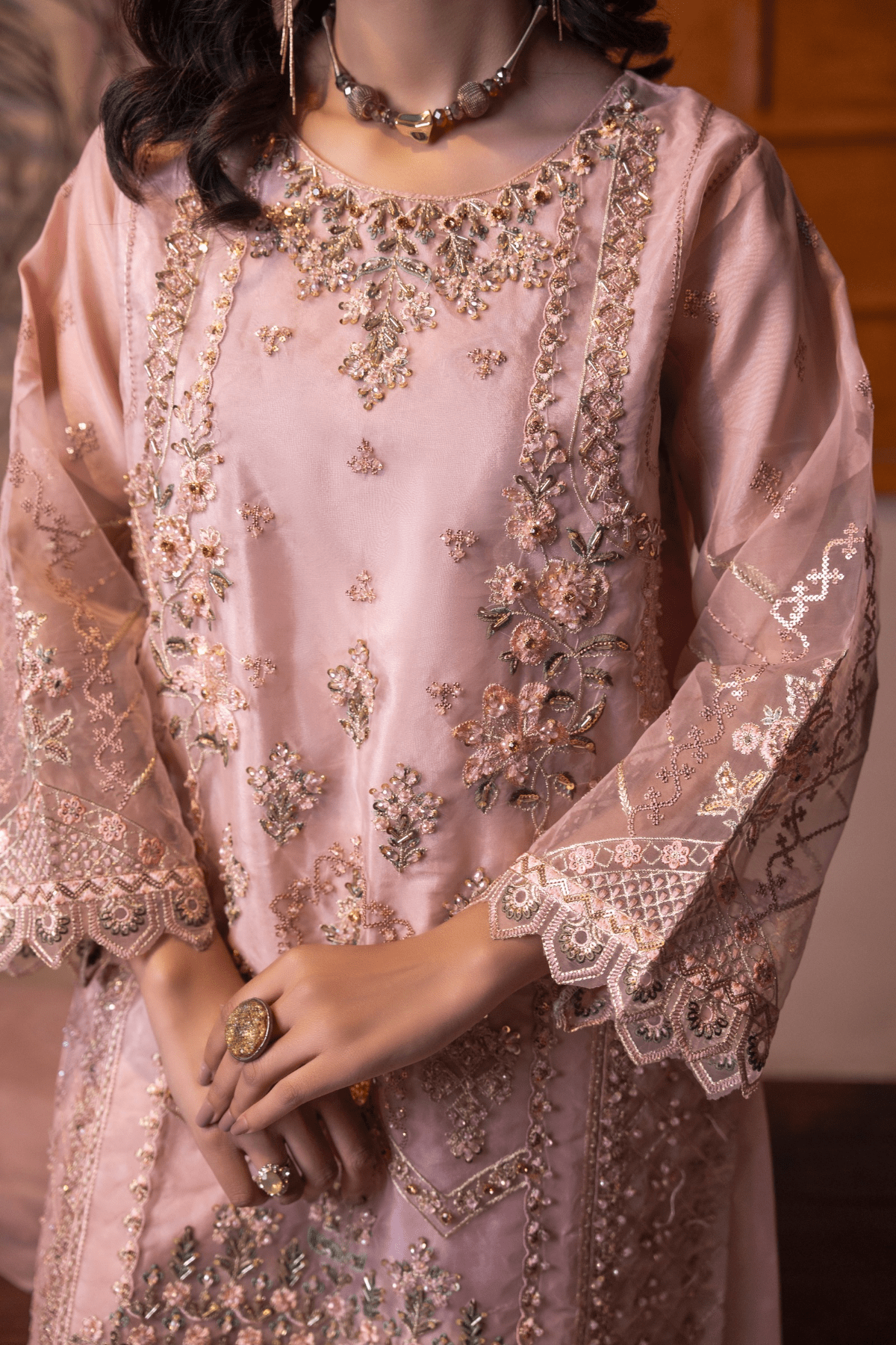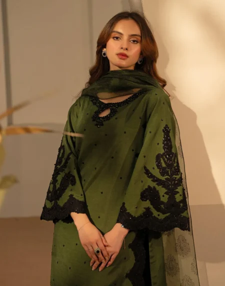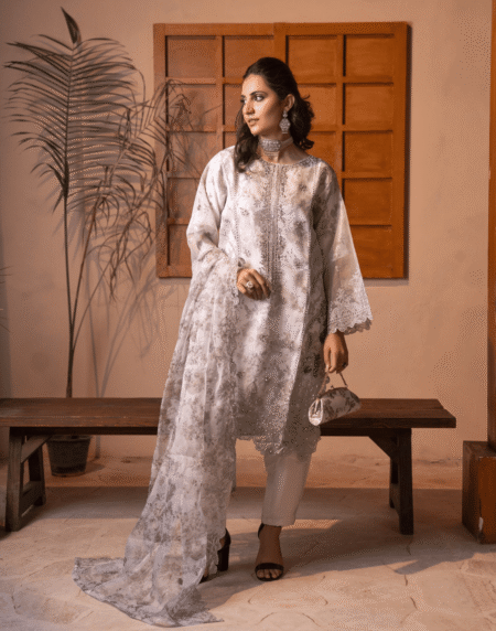 The rich Organza is enhanced with handwork and embroidery, giving it a graceful and timeless appeal. Paired with a well-balanced silhouette, it reflects understated luxury and modern tradition.