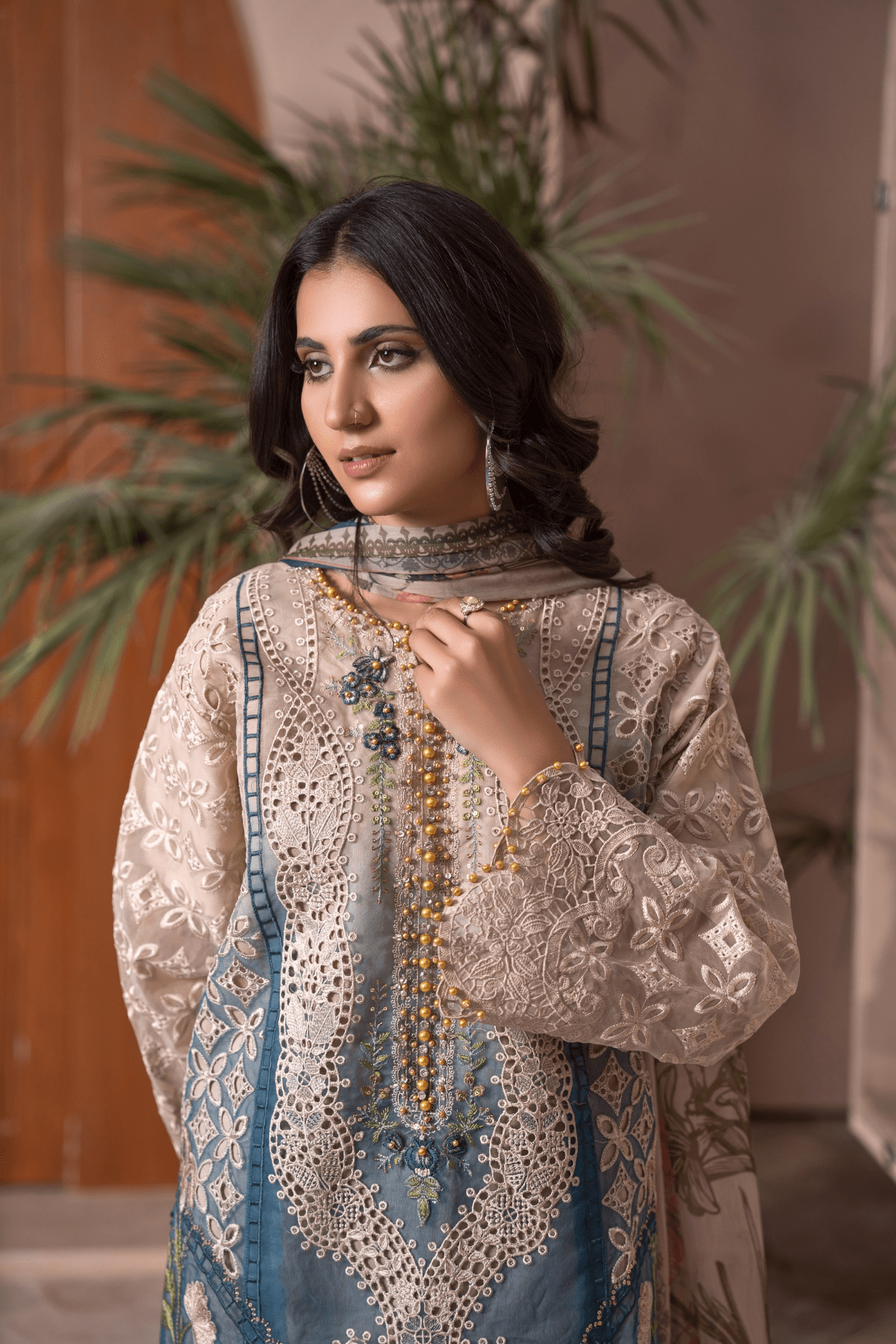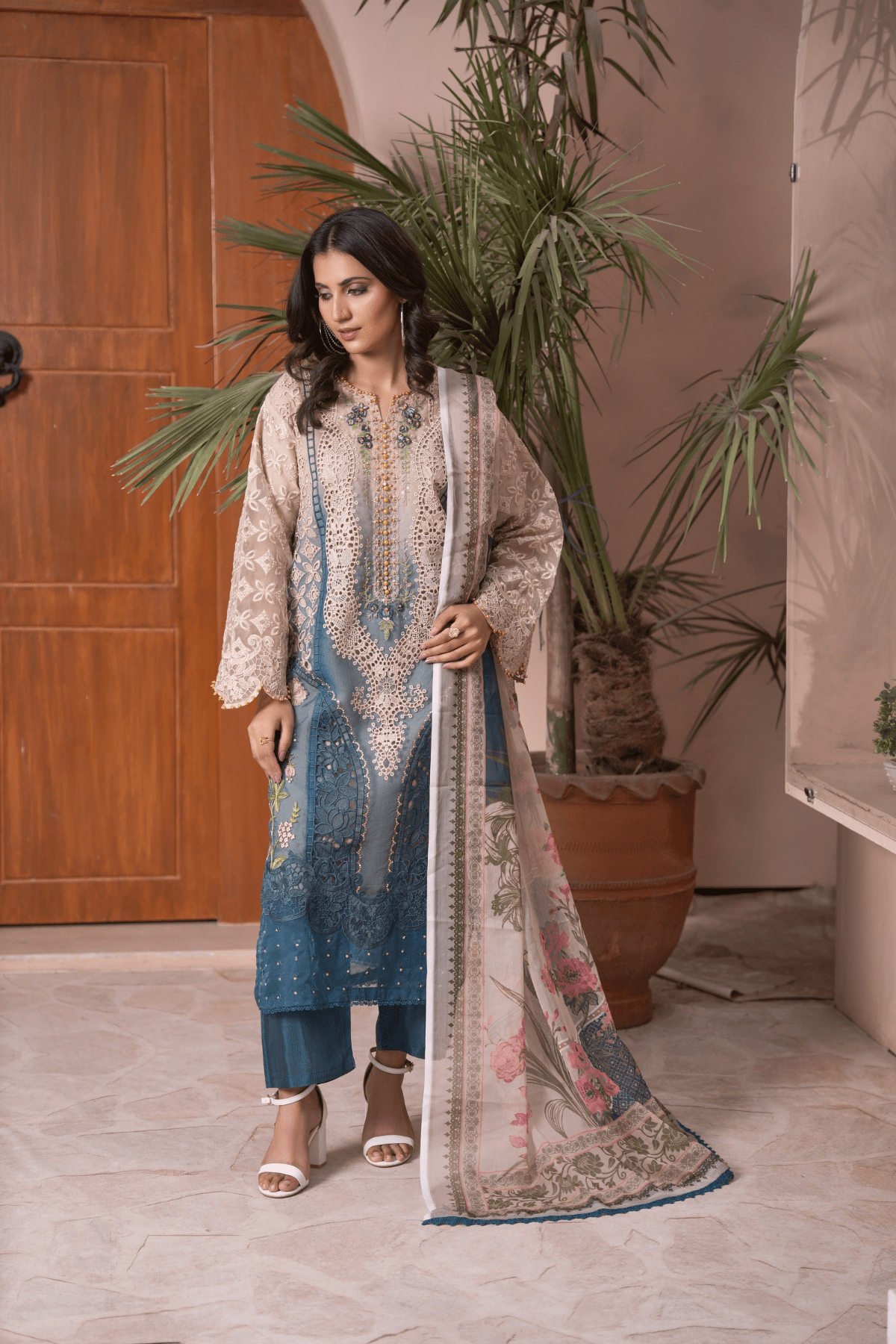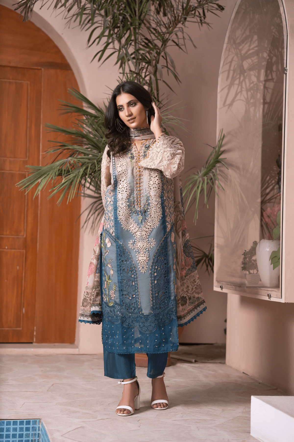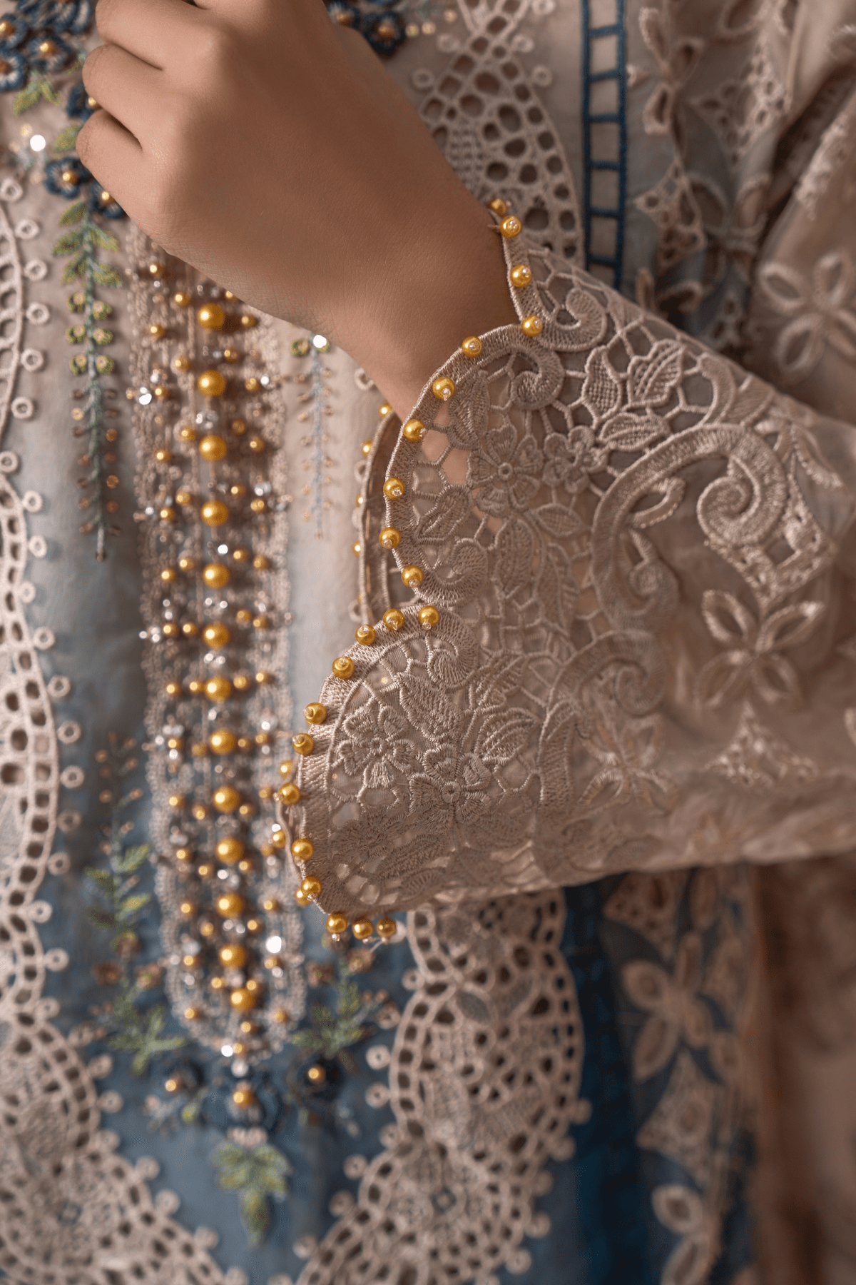 The rich Organza is enhanced with handwork and embroidery, giving it a graceful and timeless appeal. Paired with a well-balanced silhouette, it reflects understated luxury and modern tradition.
